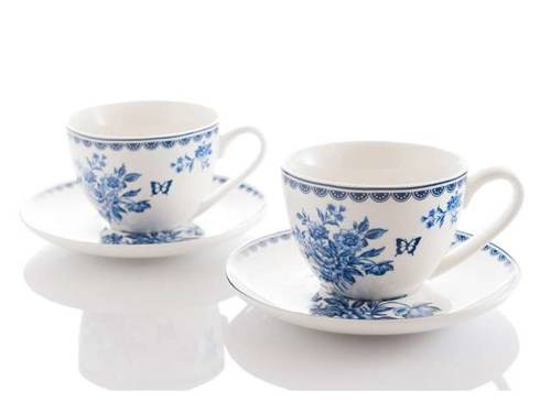 - Zestaw 2 filiżanek ze spodkami zdobiony motywem kwiatowym w kolorystyce kobaltowej. Filiżanki wykonane z dobrej jakości porcelany.