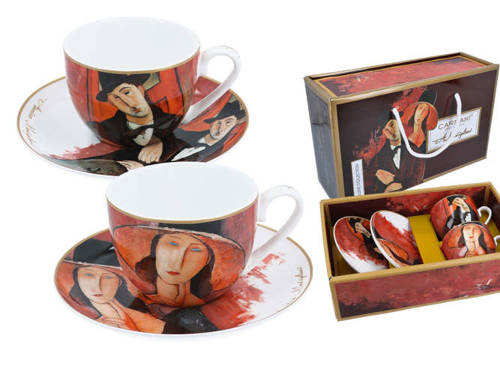 - Zestaw 2 filiżanek o pojemności 250ml ze spodkami. Zestaw wykonany z wysokiej jakości porcelany zdobionej motywem z obrazu A. Modigliani Kobieta w kapeluszu i Mario Varvogli. Filiżanki w ozdobnym opakowaniu.