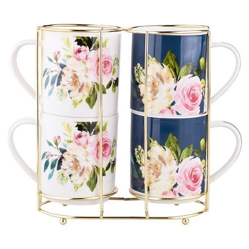 Zestaw 4 porcelanowych kubków na złotym stojaku