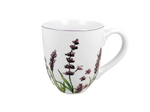 Kubek 1000 ml ze wzorem w kwiaty lawendy. Dzięki swojej dużej pojemności doskonale sprawdzi się również do podawania zup czy płatków śniadaniowych.