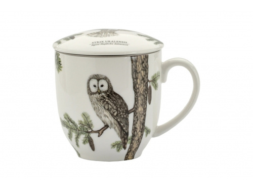 - Duży, porcelanowy kubek z zaparzaczem z motywem Puszczyka Uralskiego z kolekcji Ptaki Polski Agata Hajdecka.